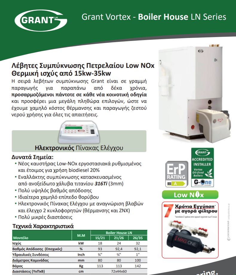 Η σειρά λεβήτων συμπύκνωσης Grant είναι σε γραμμή παραγωγής για παραπάνω από δέκα χρόνια, προσαρμοζόμενοι πάντοτε σε κάθε νέα κοινοτική οδηγία και προσφέρει μια μεγάλη πληθώρα επιλογών ώστε να έχουμε χαμηλό κόστος θέρμανσης και παραγωγής ζεστού νερού χρήσης για όλες τις απαιτήσεις.